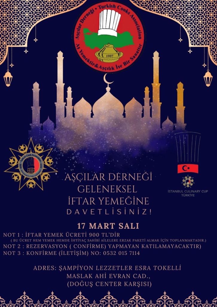 İftar yemeğine dernek kurul üyeleri ve üyelerin yanı sıra birçok şef ve firmada katılım sağlayacaktır.